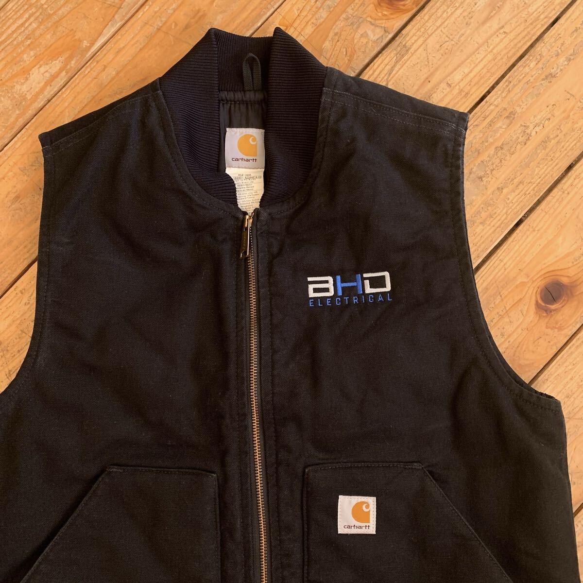 - USA古着 Carhartt カーハート ダックベストメンズ Mサイズ フルジップ 裏キルティング 企業ロゴ カジュアル ストリート ブラ Black J4127
