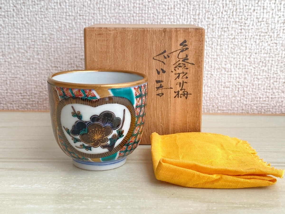 > 【SK132】九谷焼 三代 為吉 詠一 作 ぐい呑み 金彩 色絵 松竹梅 直径約5.5cm 高さ約5cm 共布共箱 陶磁器 酒器 伝統工芸 美術品
