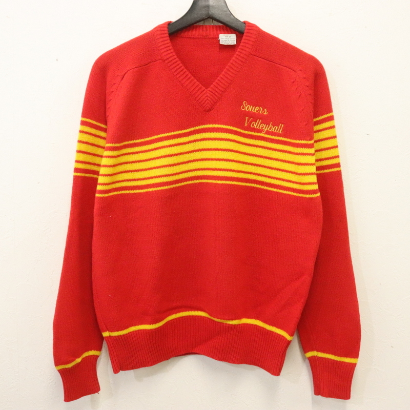 > T143 80sビンテージ アクリルニットセーター■1980年代製 表記Mサイズ レッド ボーダー Vネック ししゅう オールド 古着 激安 希少