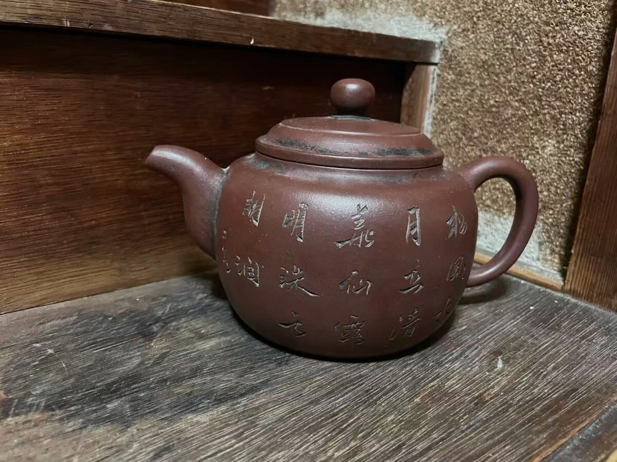 > コレクター放出品 中国古美術 在銘あり 彫刻 朱泥紫砂 急須 時代物 アンティーク 紫砂壺 茶道具 中国宜興 茶壷 紫泥 朱泥 旧家蔵出