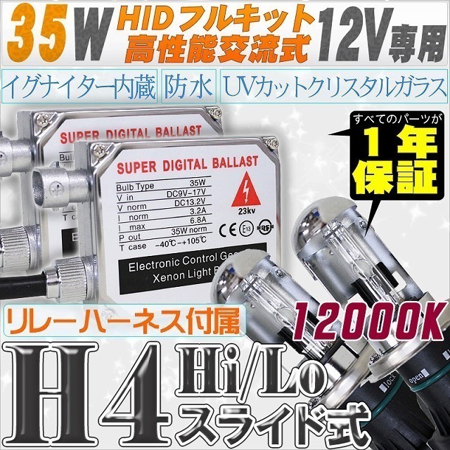 > 高性能 HIDキット 35W H4 Hi/Loスライド式 リレー付 12000K 【交流式バラスト&クリスタルガラスバーナー】