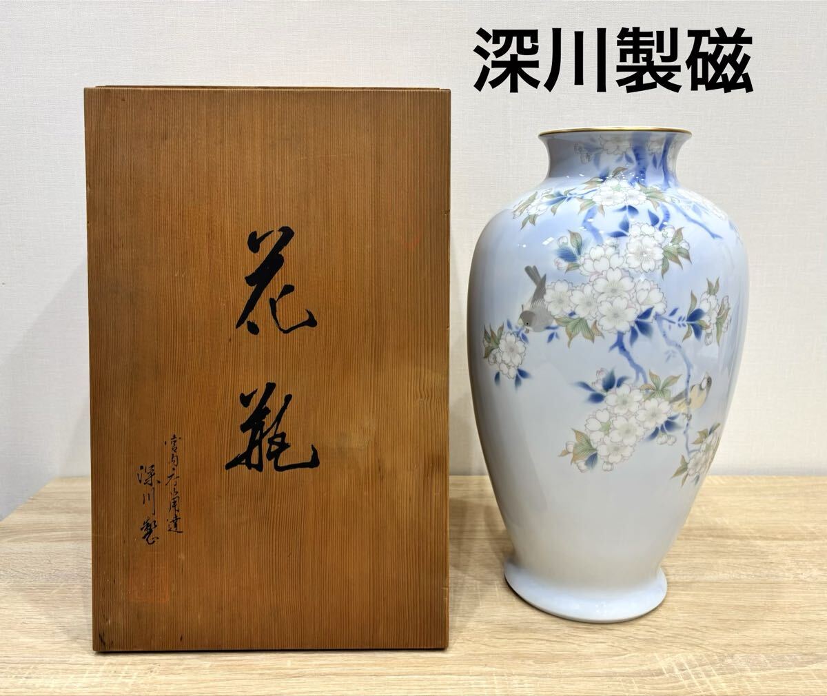 > 深川製磁 桜小鳥 細長12号 花生 美術 有田焼 宮内庁御用達 花瓶 花器 花入 華道 壺 染付官窯 伝統工芸 工芸品 箱付 美品 置物 深川製