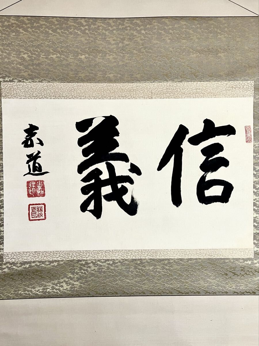 - 【真作】【S8】原嘉道「信義」絖本 肉筆 置字 二言 書 横物 掛軸 明治-昭和時代の弁護士 政治家 長野の人 中央大総長 枢密院議長