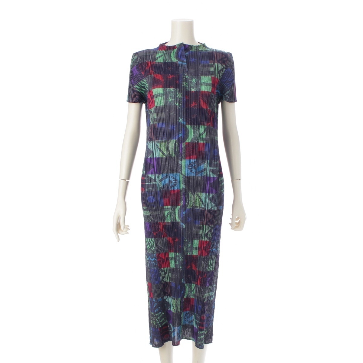 > プリーツプリーズ イッセイミヤケ 総柄 ボトルネック ロング 半袖 ワンピース PP71-JH588 ブルー系 4【中古】