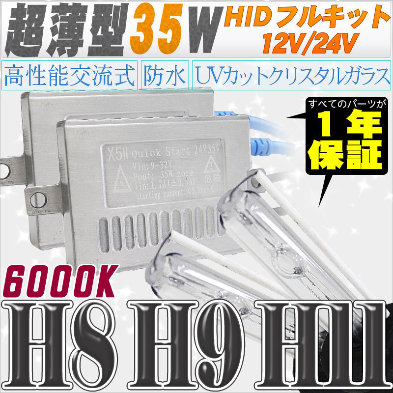 - 高性能 薄型HIDキット 35W H11/H8 6000K 12V/24V 【交流式バラスト&クリスタルガラスバーナー】