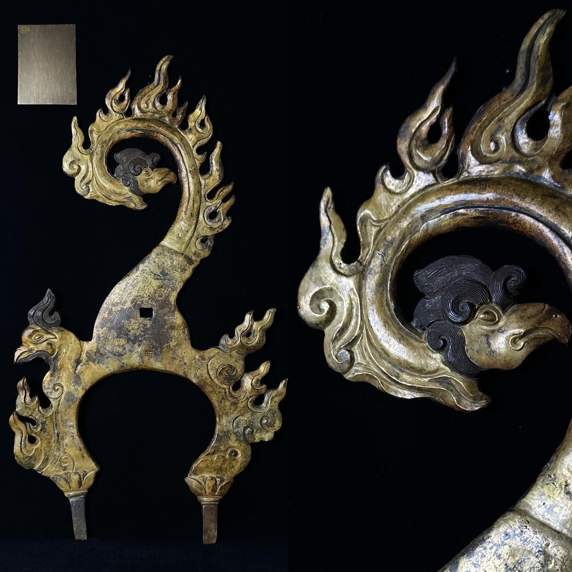 > コレクター買取品 仏教美術 古銅製 鍍金 仏像の光背 唐物 鳳凰 仏具 木箱付 金属工芸 細密彫刻 飾物 置物 中国古玩 時代物