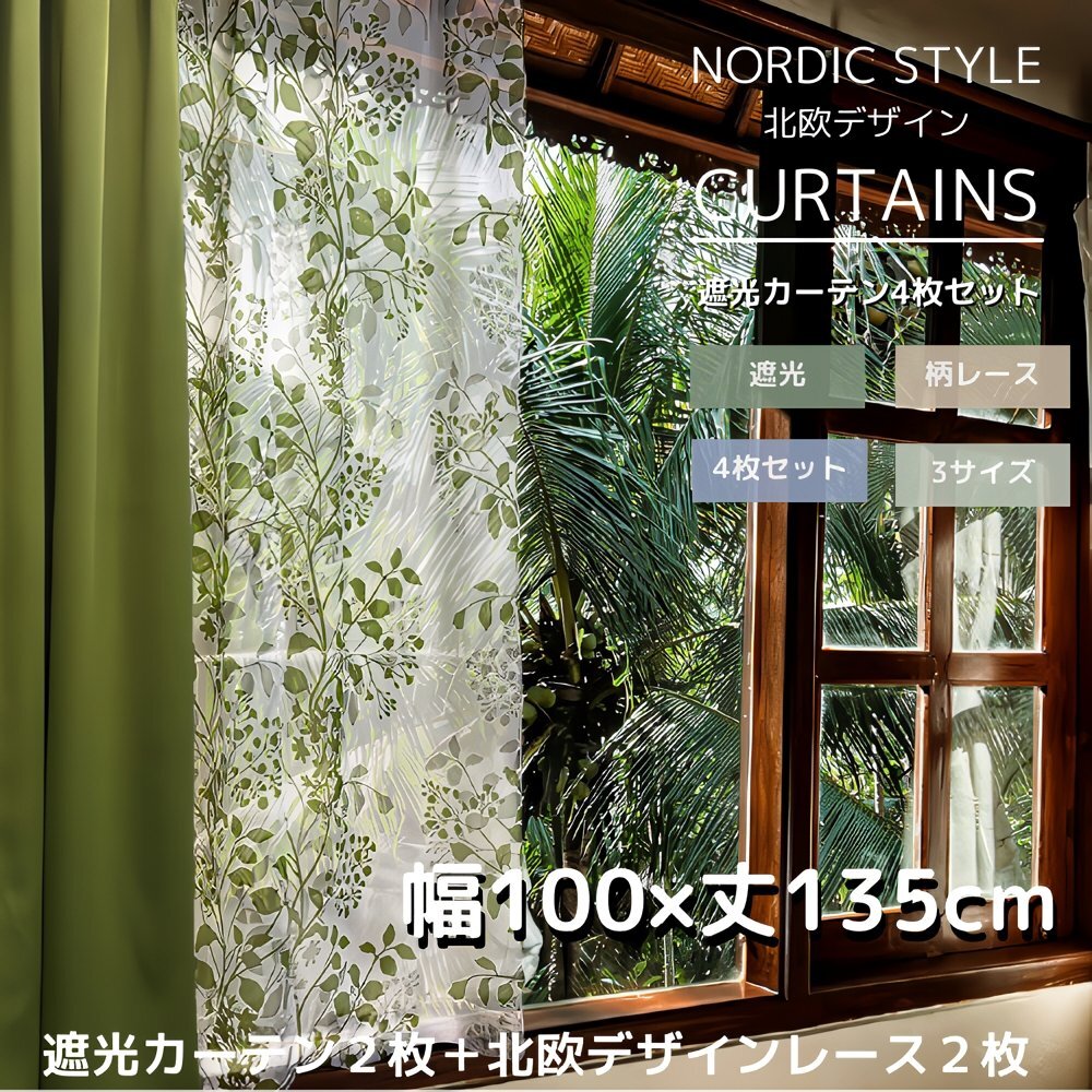 - 遮光カーテン 4枚セット 【柄/色:Cリーフ/グリーン】 (遮光カーテン幅100×丈135㎝2枚+柄レース幅100×丈133㎝2枚)
