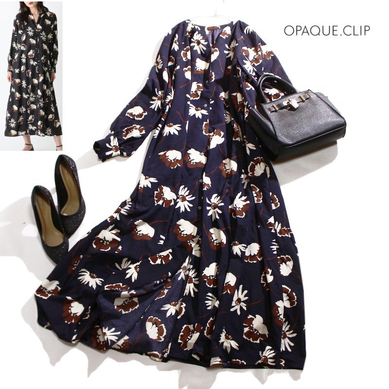 > 美品 オペ―ク ドットクリップ OPAQUE.CLIP 株) ワールド BIGフラワープリント 柄 長袖 マキシドレス シャツワンピース ネイビー 紺 M