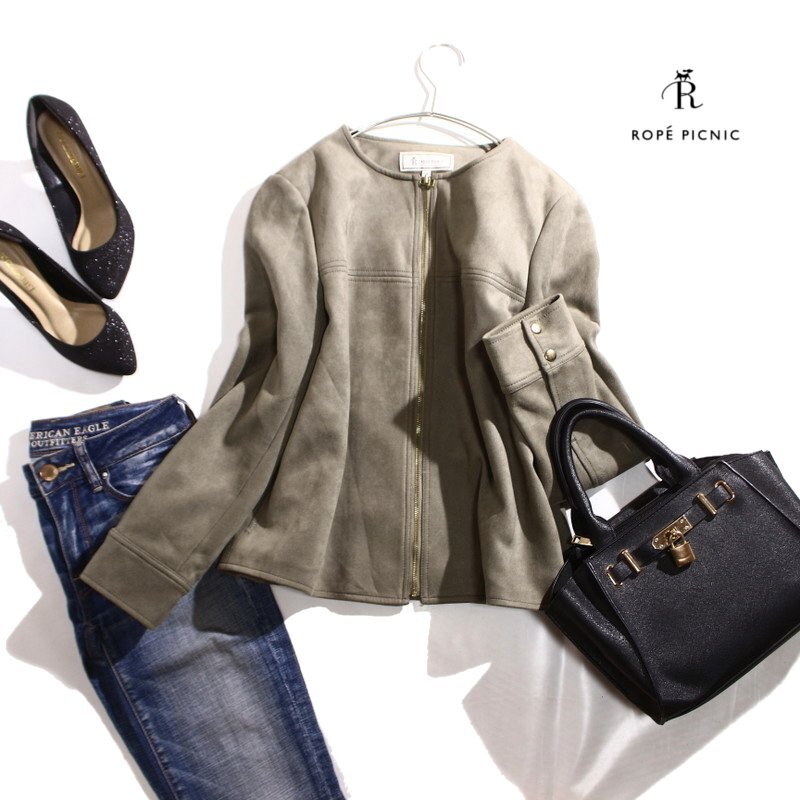 > 美品 ロペ ピクニック ROPE' PICNIC 秋 冬 スエードライク ノーカラー レザージャケット 9号 38 カーキ グレー ノーカラージャケット 定番