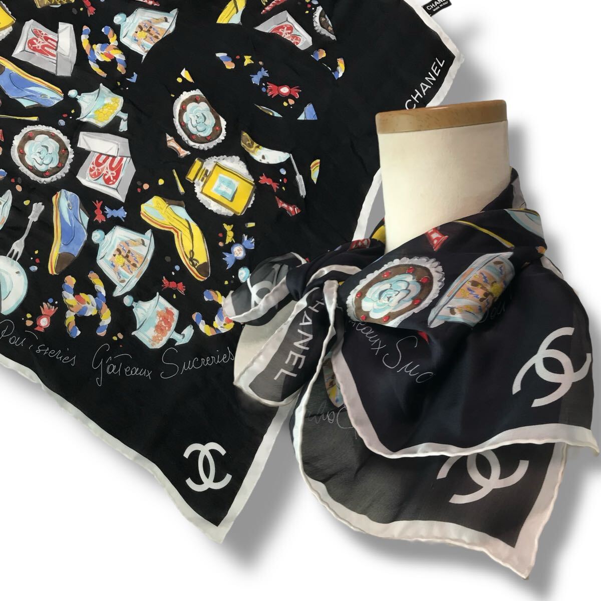 > d7 レア 良品 CHANEL シャネル ココマーク シルク スカーフ シースルー 総柄 絹100% ブラック イタリア製 正規品