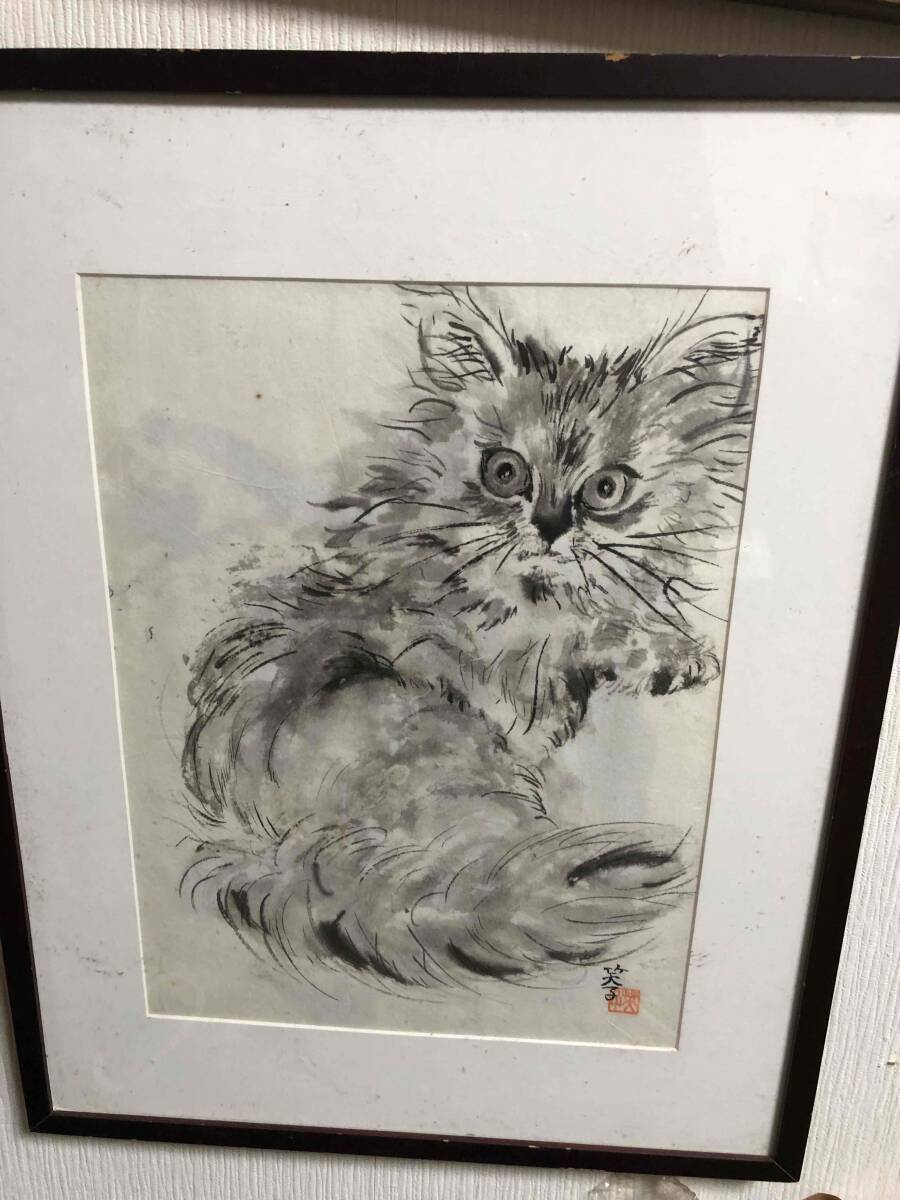 - 額装品/昭和期?平成初期?/ 美術教師絵/水墨画?/ 猫の絵 2