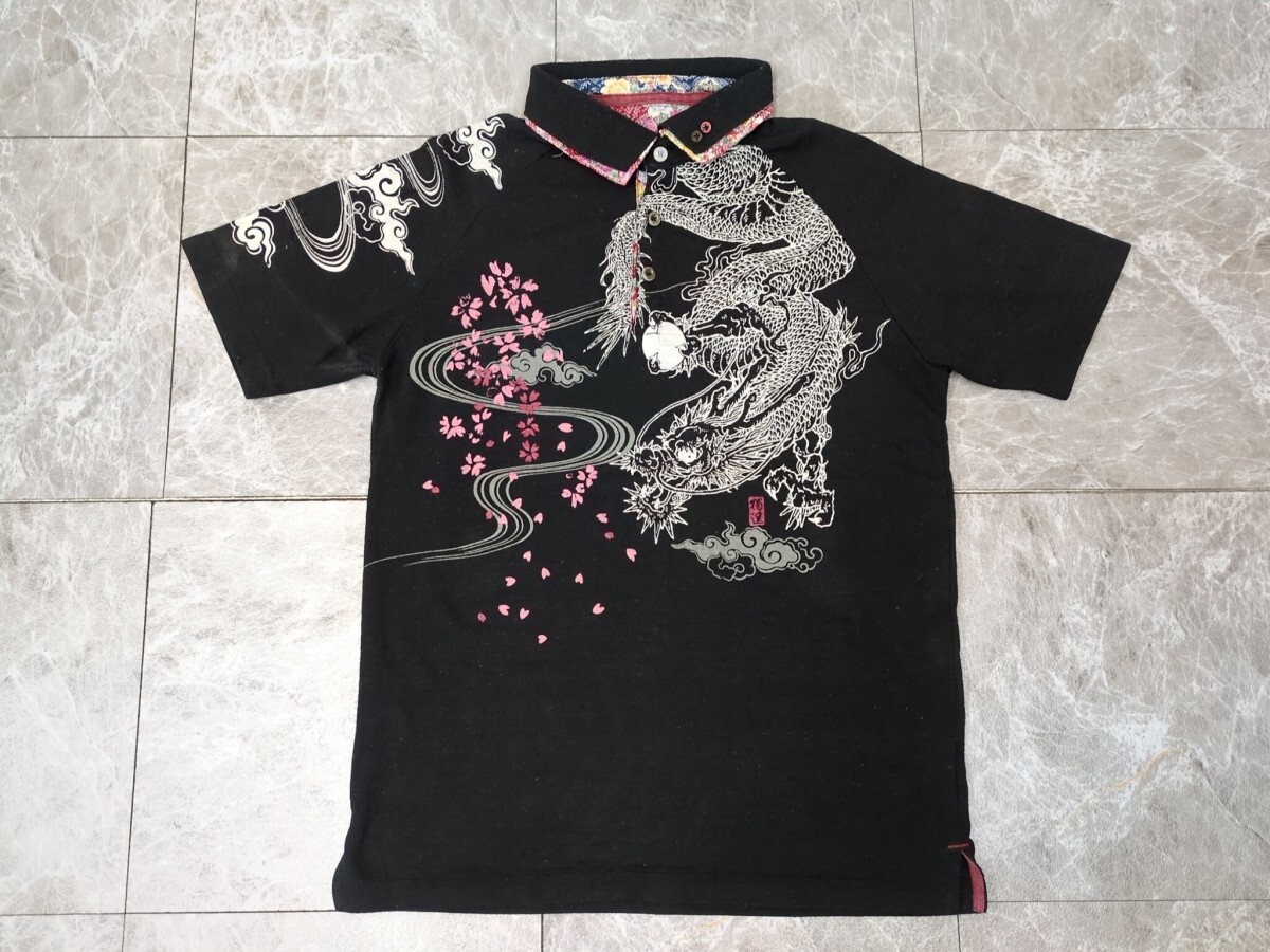 - 16.雲龍 Y2K デカロゴ 豪華デザイン 如意宝珠 撫威羅守 吉祥瑞獣 和風 和柄 花柄 襟レイヤード 半袖 ポロシャツ メンズM 黒白ピンク x307