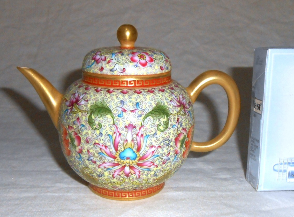- 中国 色絵 蝙蝠草花文 金彩 急須 箱入美品 茶注 ポット 茶器 茶道具 粉彩? 異彩珍品? 景徳鎮?