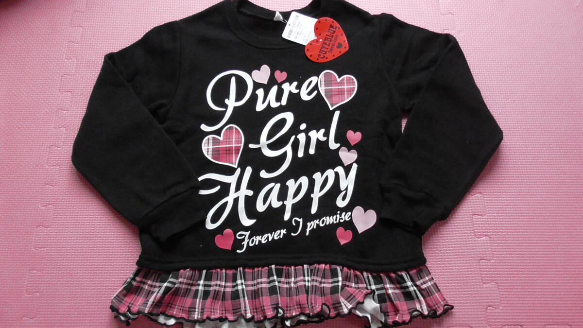> 新品 130 裾フリル 長袖トレーナー 黒 ピンク タータンチェック ハート 保育園 幼稚園 小学生 双子 女の子 秋物 冬物 120cm~ 送料無料