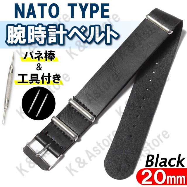 - 腕時計 替えベルト NATO タイプ 交換用 レザー 革 ストラップ バンド メンズ バネ棒付き 工具付き ブラック 20mm