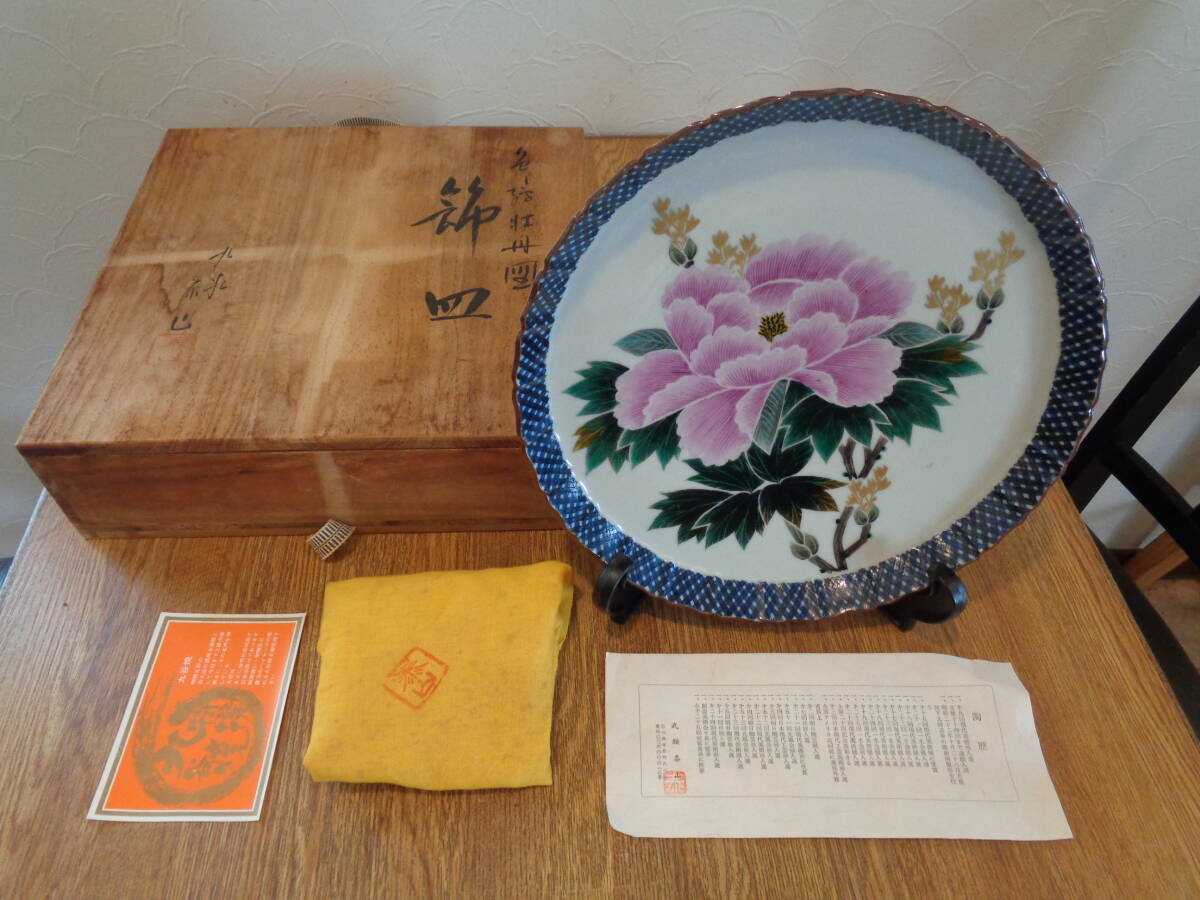 - 九谷焼 名工 竹腰泰山 色絵ボタンの図 飾り皿 未使用保存品 販売価格14000円