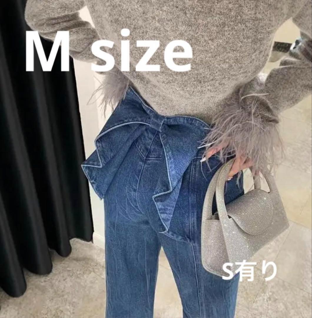 - 【新品!】デニム パンツ ジーンズ バックリボンデニム ストレート 韓国 M