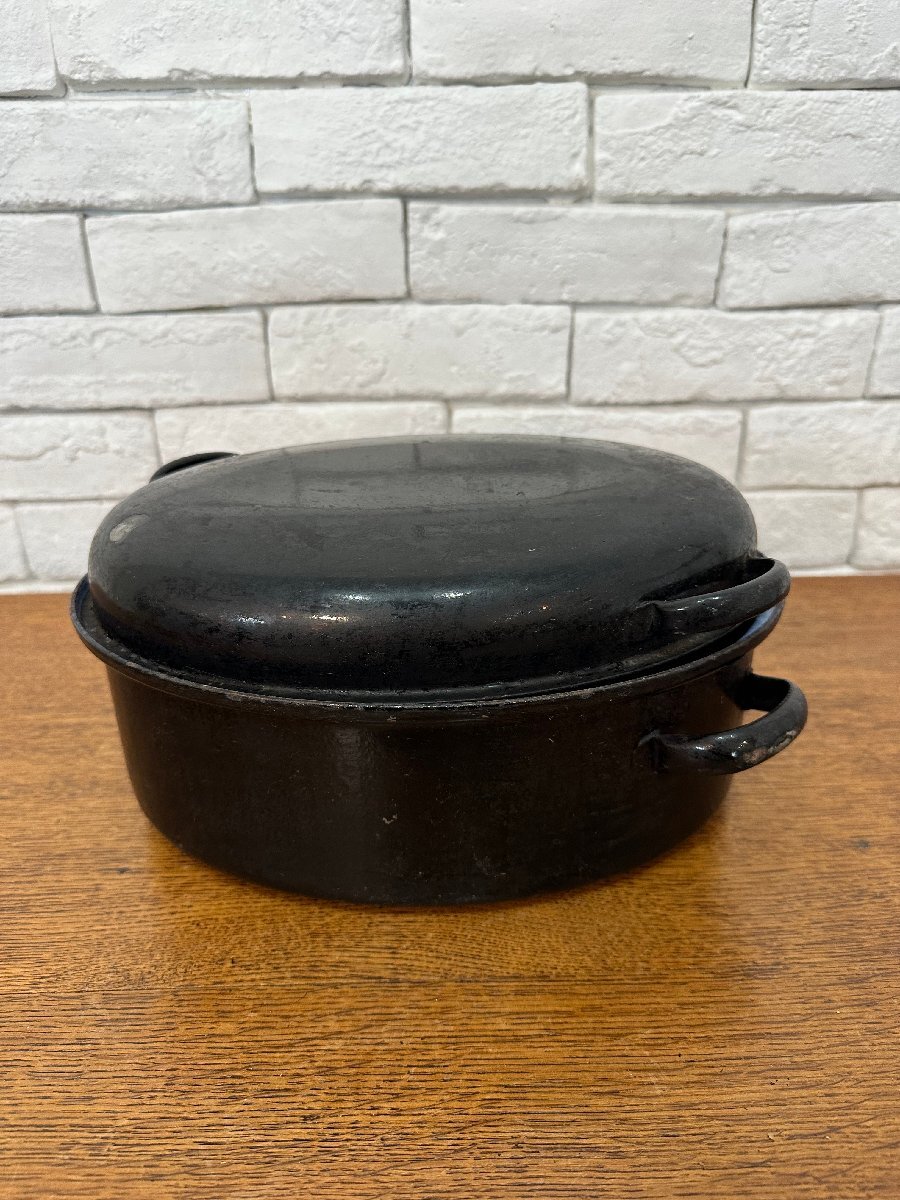 外側がブラックカラー、内側がブルーカラーの蓋付き、ロースト料理が可能な大きさの商品です。