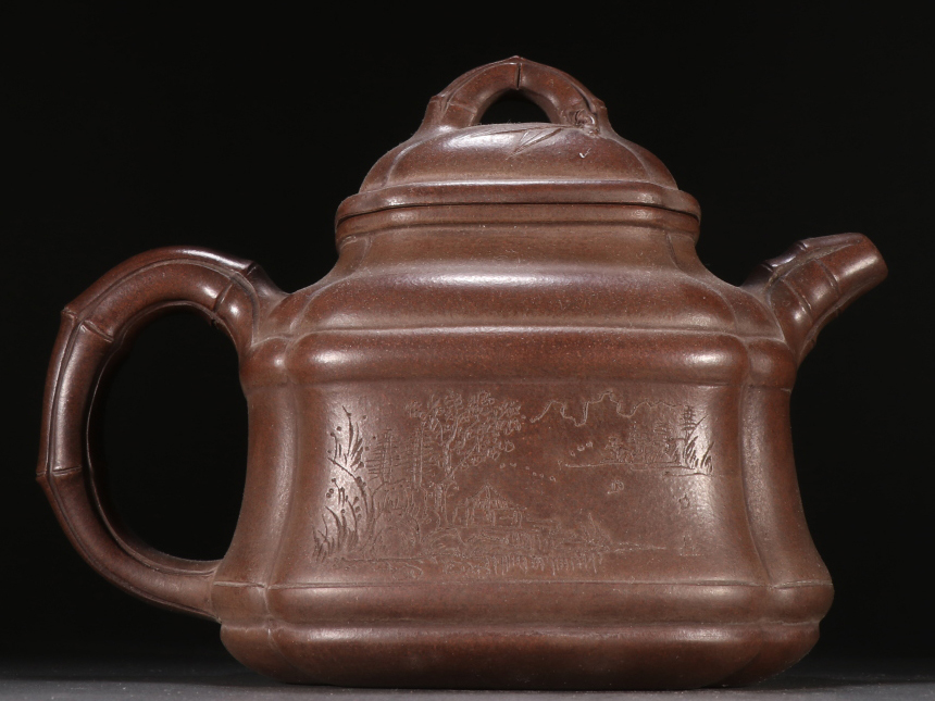 - ▽鴻▽民国時代 在銘 山水風景紋茶壺 宜興紫砂 常滑 朱泥急須 煎茶道具 茶壷 時代物 中国古美術 骨董品
