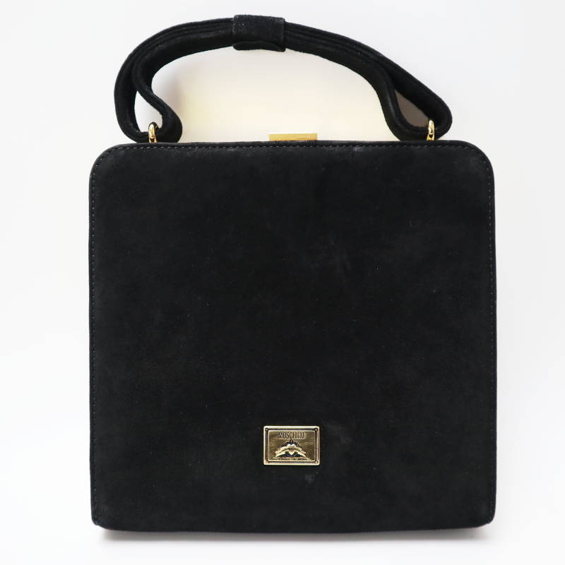 - MOSCHINO モスキーノ スエード がま口 クラッチ ミニハンドバッグ ミニポーチ ブラック/ゴールド S07-k029