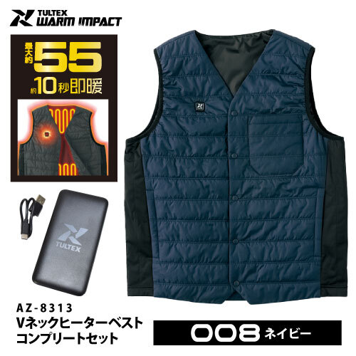 > 在庫処分!アイトスTULTEX 防寒 電熱 ベスト 【 AZ-8313 】Vネック ヒーターベスト コンプリートセット■LLサイズ■ネイビー色 手洗いOK