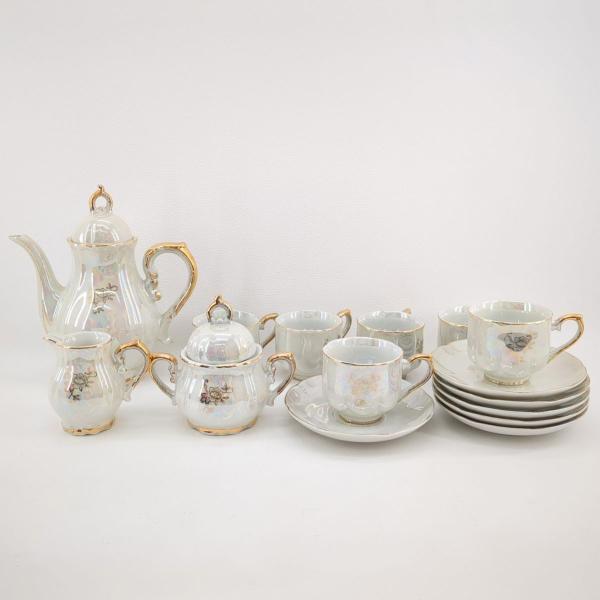 > K.Hチャイナ オーロラライン 9点セット カップ&ソーサー6P ティーポット シュガーポット クリーマー 金彩 昭和レトロ ◆2005