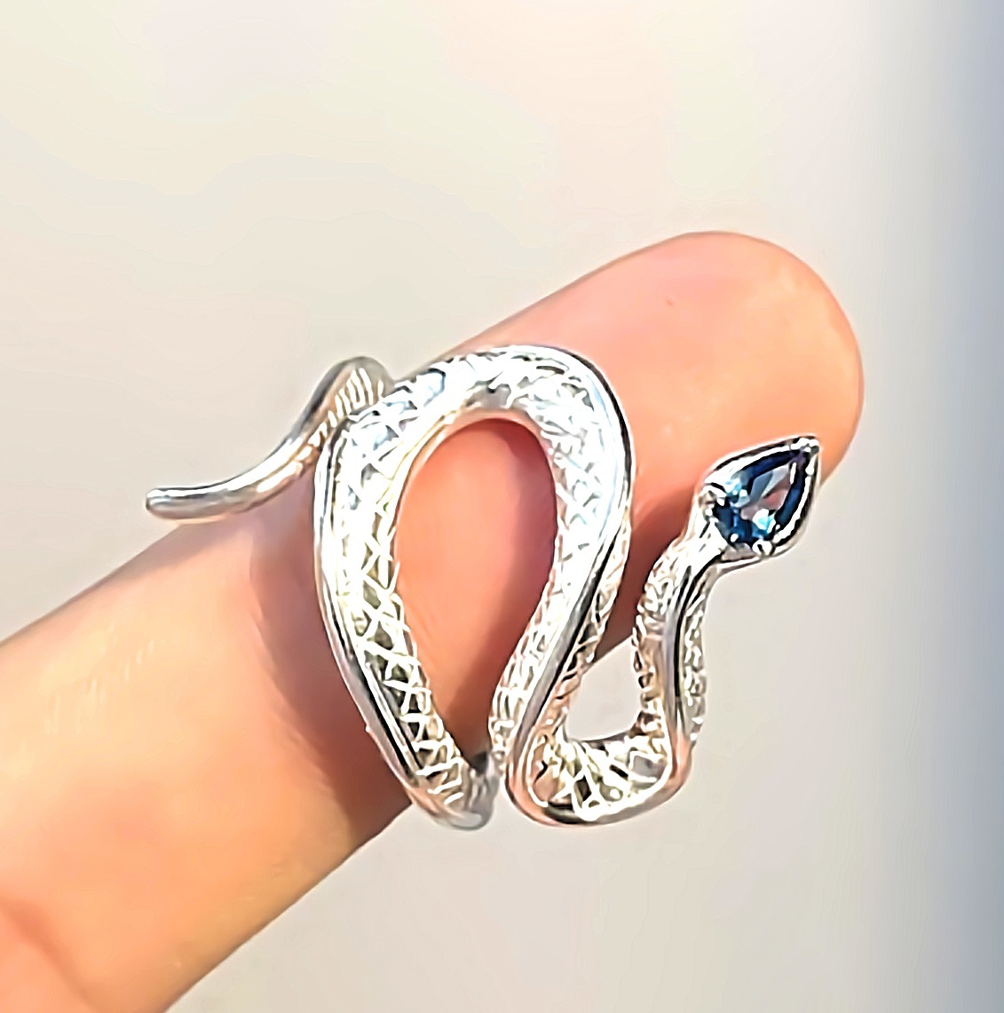 > 新品★送料無料★サファイア幸運スネーク フリーサイズ プラチナ仕上 925シルバーリング 誕生日プレゼント旅行秋祭連休ギフト国内発送