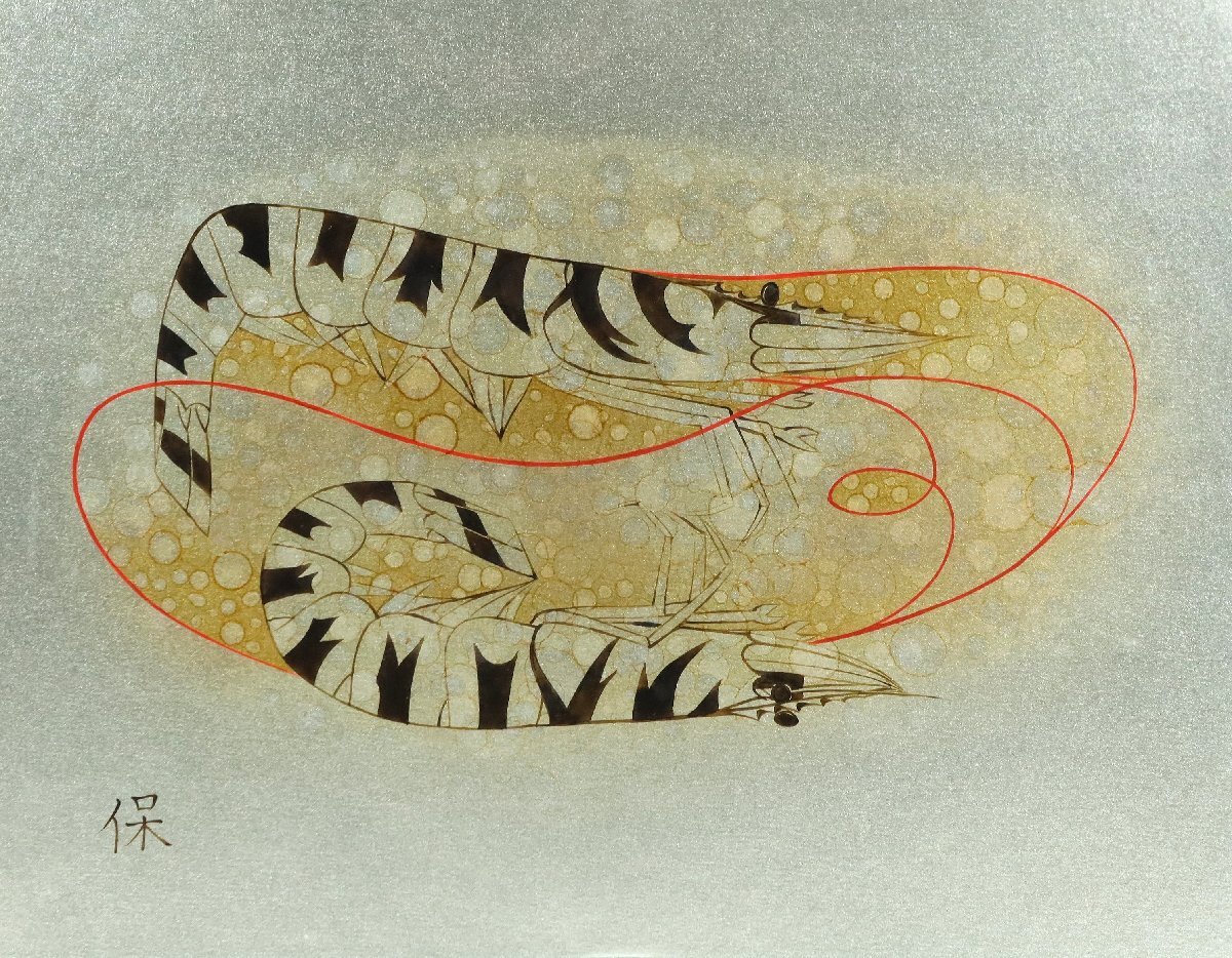 ・長尾保「漆絵いそ」漆画 額装品 /漆額 漆芸 海老 140