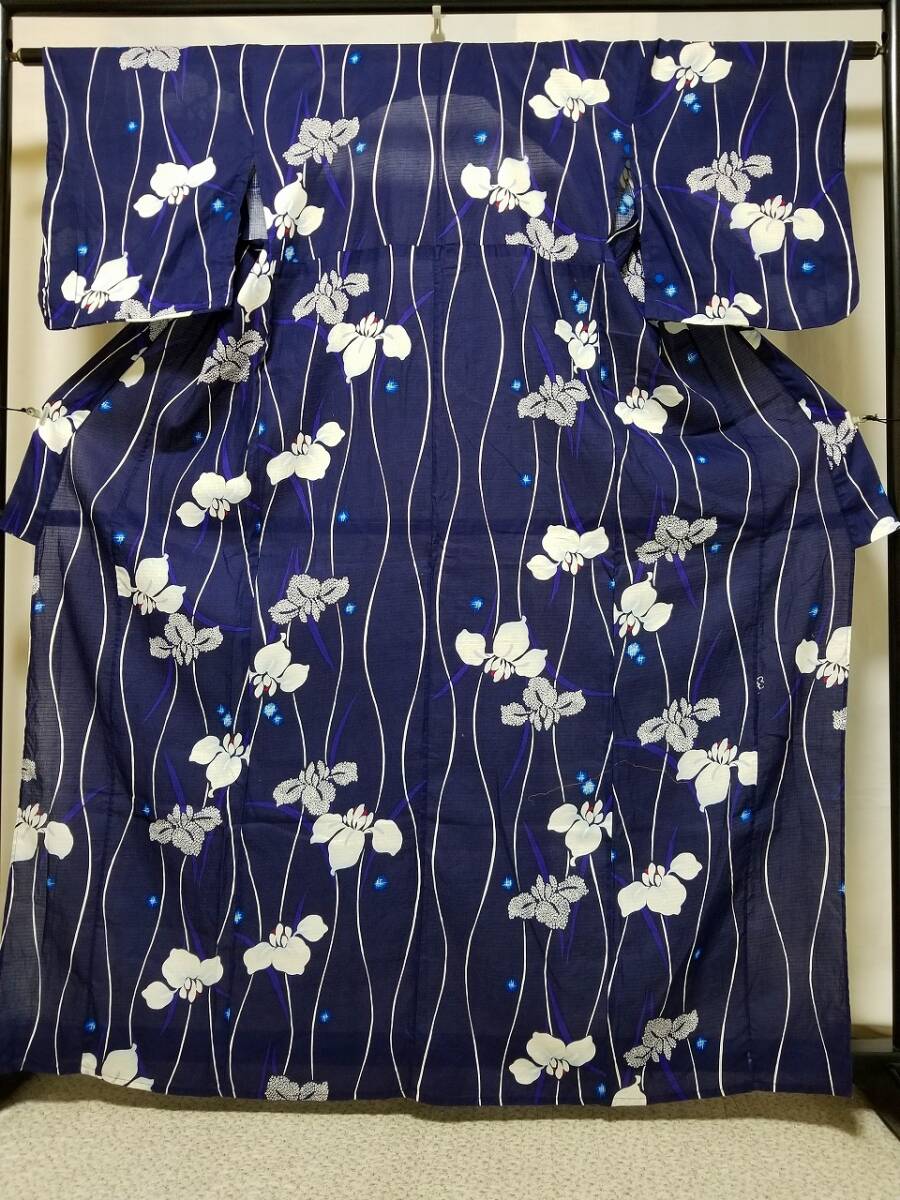 > 【桐徳】即決品*浴衣{綿100%*紅梅地*浴衣}*身丈169-裄65*藍鉄色地*小格子地紋*白染の縦ヨロケ縞と.2配色の花菖蒲*№7449