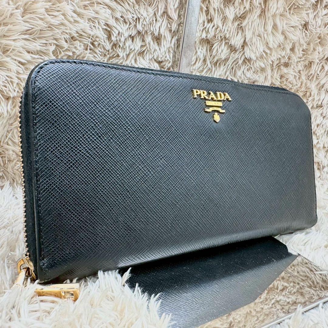 - 【極美品】PRADA プラダ 長財布 ラウンドファスナー ブラック サフィアーノレザー 本革 ゴールドロゴ ユニセックス メンズ レディース
