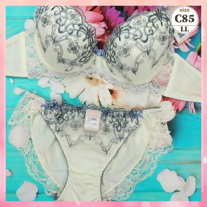 - Zc8541◆新品 ブラショーツセット 【C85/LL】下着 ランジェリー 蒸れ軽減 穴あきカップ オーナメント刺繍 シトロン