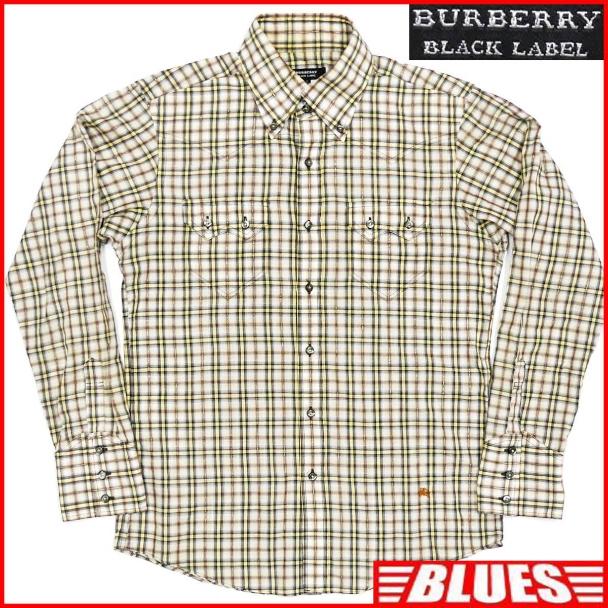 > 即決★BURBERRY BLACK LABEL★メンズM 廃版 チェックシャツ バーバリーブラックレーベル 2 茶 黄色 三陽商会正規 ナイト刺繍 長袖