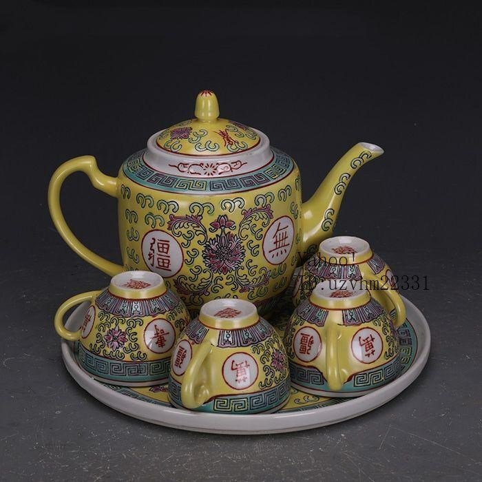 - 黄地の手作りパステルカラー万寿無疆の 茶器 茶碗 急須 新品未使用です