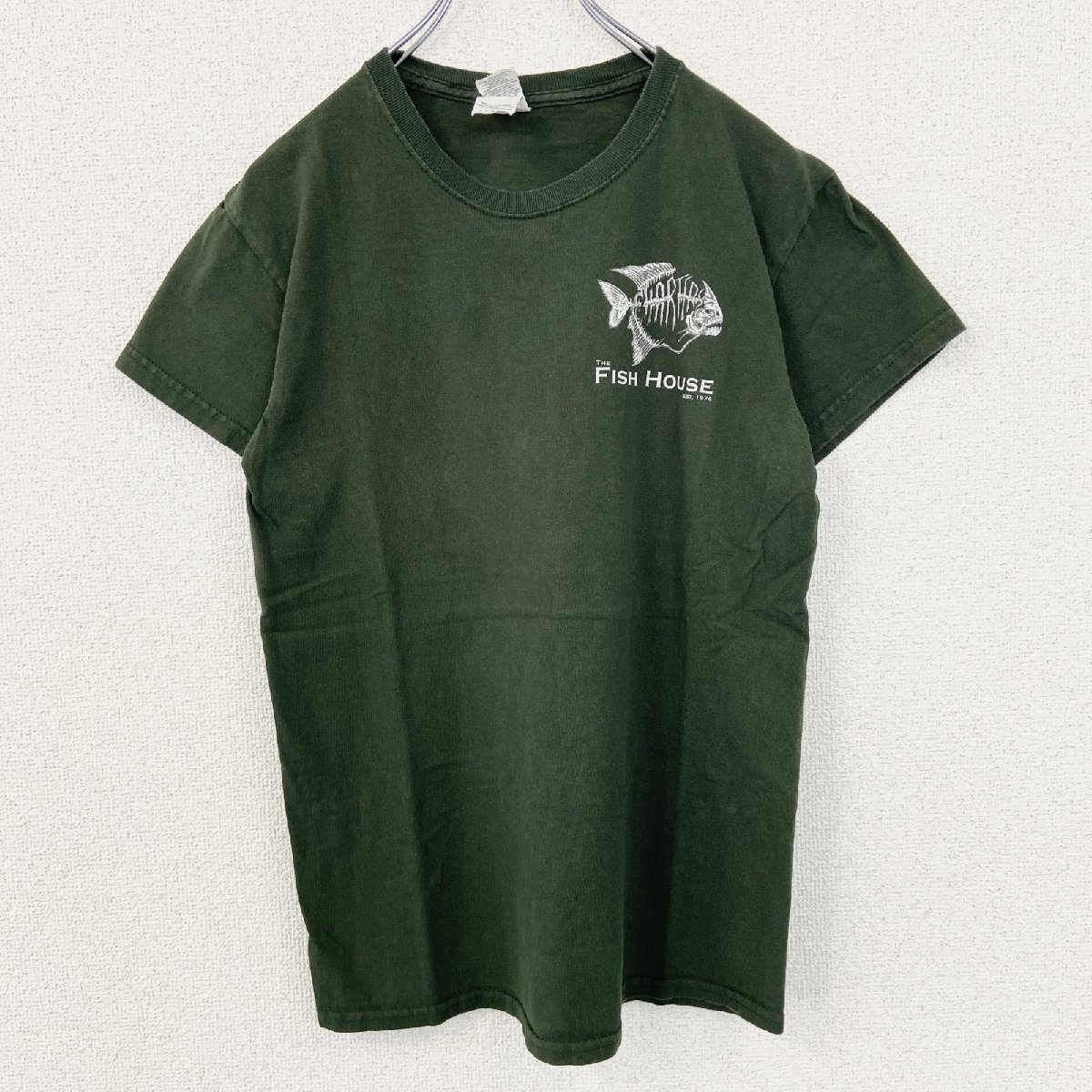 - 古着 used GILDAN ギルダン 半袖プリントデザインTシャツ クルーネック FISH HOUSE 緑 レトロ Sサイズ