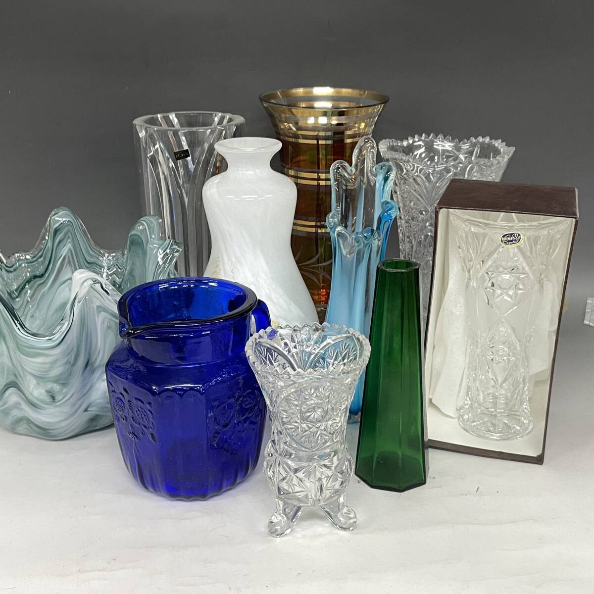 - KF14/40 ガラス 花瓶 まとめて 10点 フラワーベース 硝子 クリスタル カットグラス 花器 花生 花入 色被せ 花びん 気泡 ボヘミア 他