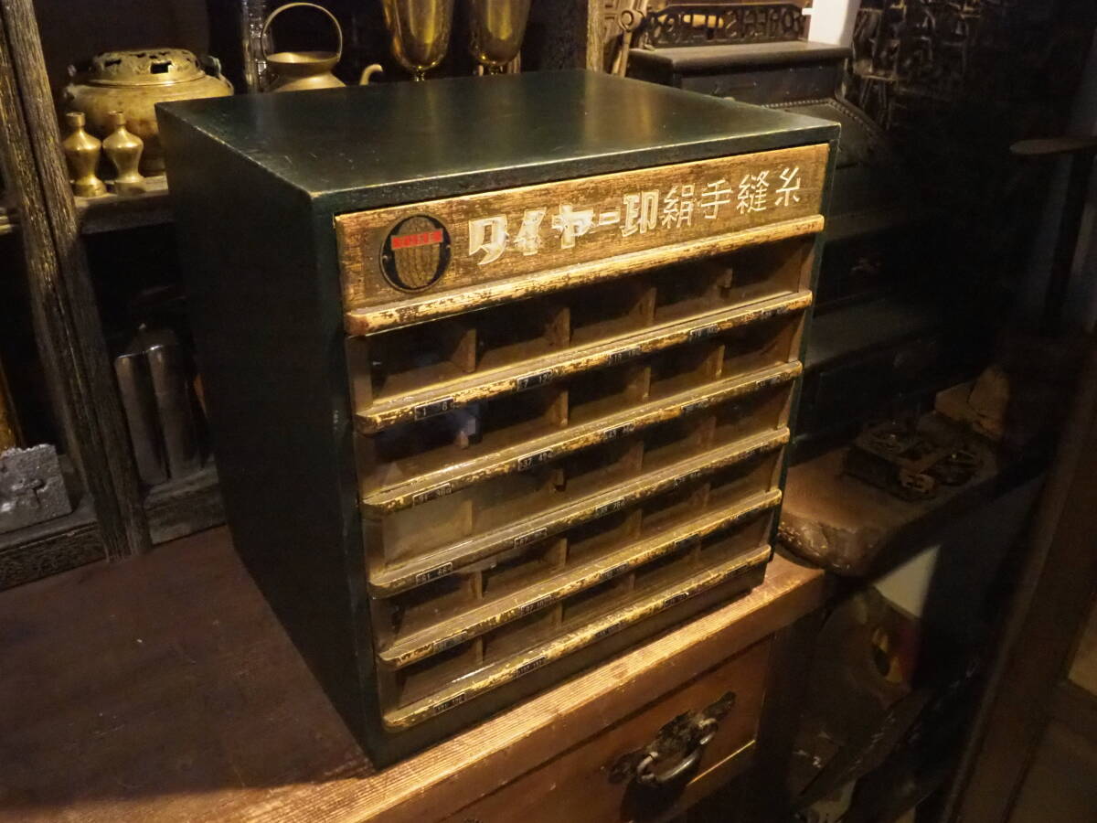 - 【タイヤ―木製ミシン糸ケース】6段昭和レトロ裁縫糸車収納函ガラスケース引出し古道具アンティーク骨董インテリア箪笥インダストリアル
