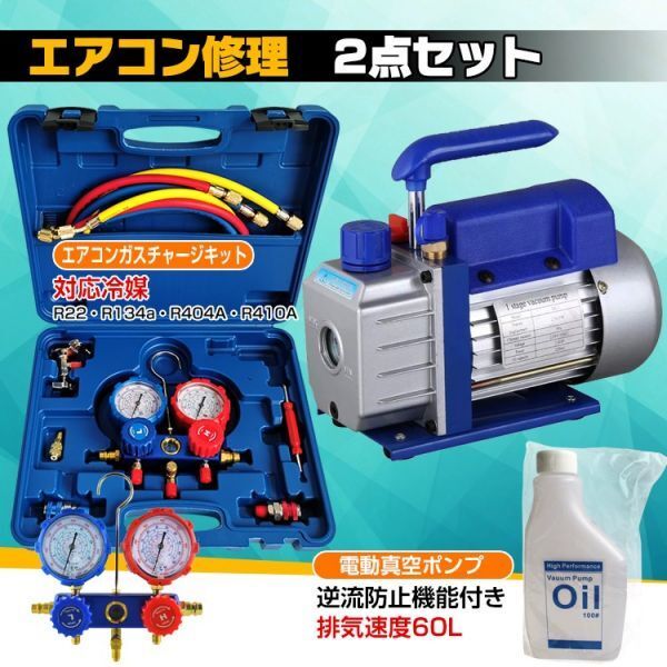 > エアコン ガス チャージ 60l/min 真空ポンプ 2点セット R22 R134a R404A R410A エアコン用 冷房 冷媒 家庭用 自動車用 工具セット ee236