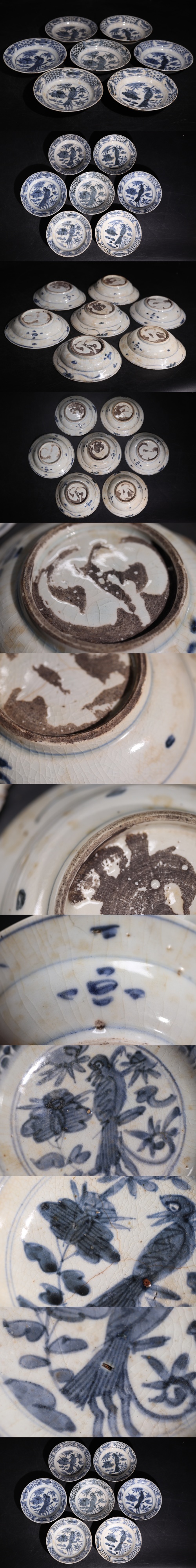 > 時代 古染付 鳥文 皿 七客 / 中国美術 明代 頃 茶器 煎茶道具 煎茶飾 .G2744