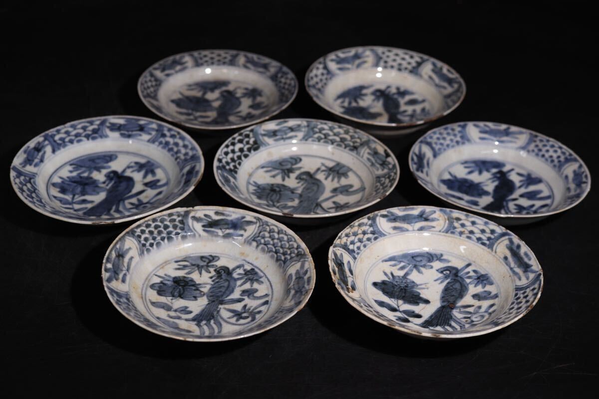 - 時代 古染付 鳥文 皿 七客 / 中国美術 明代 頃 茶器 煎茶道具 煎茶飾 .G2744