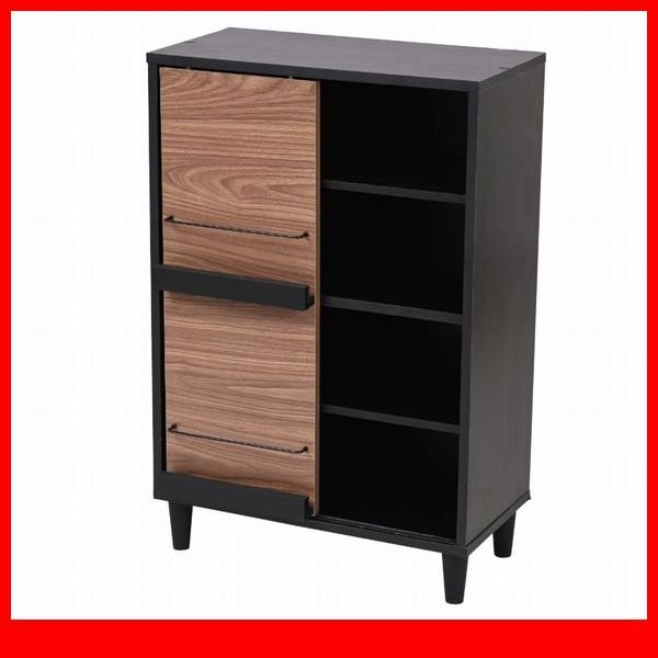 > キャビネット★新品/Adatto スライド扉&オープン/本棚 ディスプレイラック 多目的収納 可動棚/ブラック×ブラウン/a4
