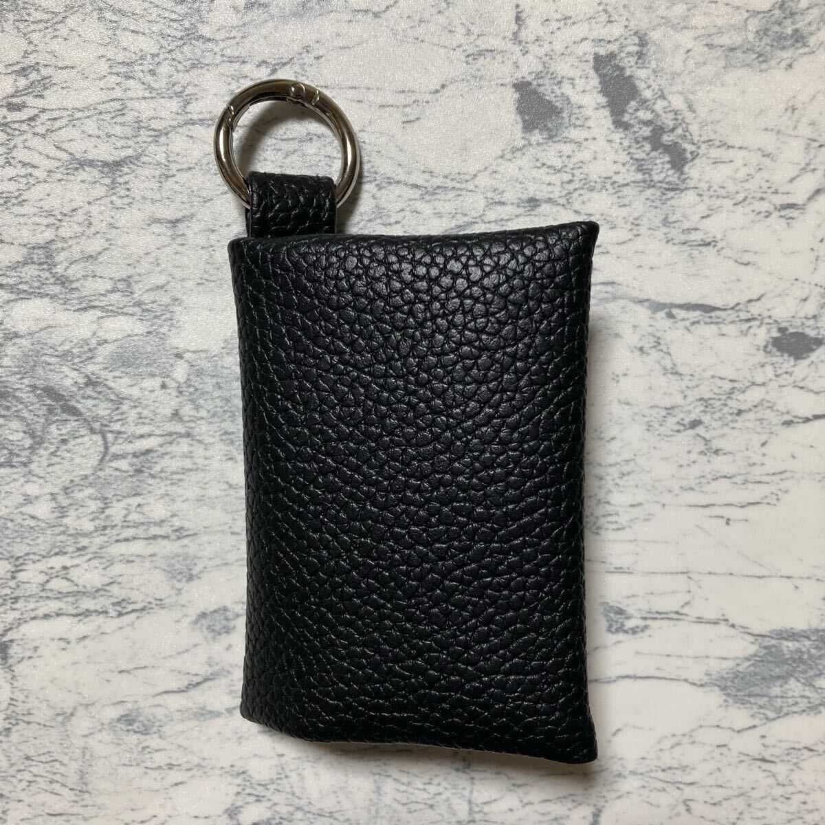 > ハンドメイド シボ加工 フェイクレザー 2つ折り ポケットティッシュケース 丸カラビナ付き 合皮 ブラック