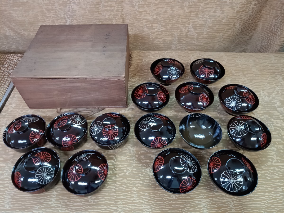 - 【漆器 蓋付き椀 菊花紋様 15点】平椀 吸物椀 煮物椀 黒塗 和食器 伝統工芸 【A7-4③】1009