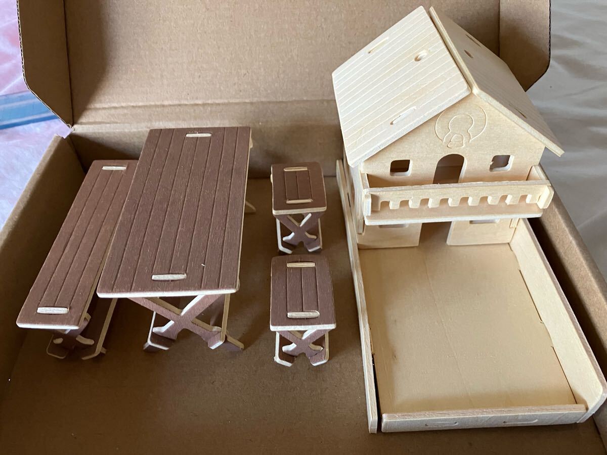 - 木製のミニチュアハウス 手作りシルバニアファミリー ドールハウス あかりの灯る大きなお家 テーブル ベンチ セット