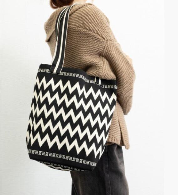 - 上質トートバッグ ニット編みバッグ 韓国風鞄 ワンサイズ ブラック系