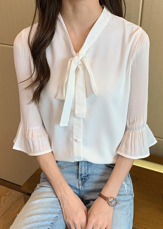 > LHK810★シフォンブラウス レディース トップス半袖シャツ シンプルカジュアルカットソーホワイトリボンスピーカースリーブ 無地