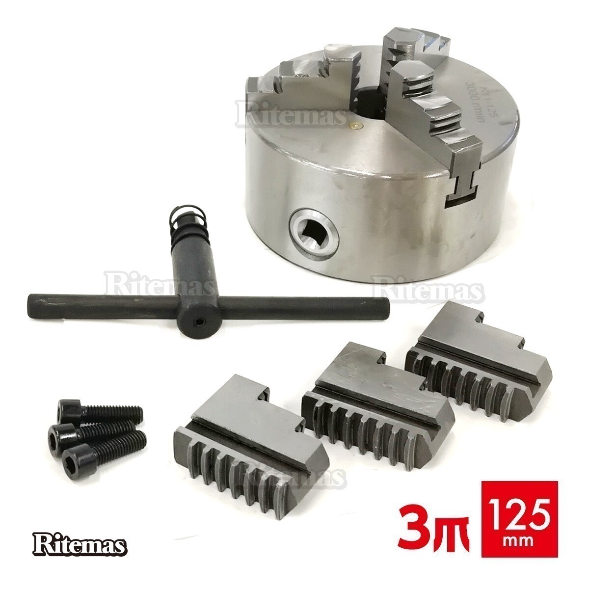 - 旋盤チャック 三爪 125mm スクロールチャック 一体爪型 3ジョー旋盤 チャック 逆爪3個セット チャックハンドル付 旋盤部品 ピンレバー付き