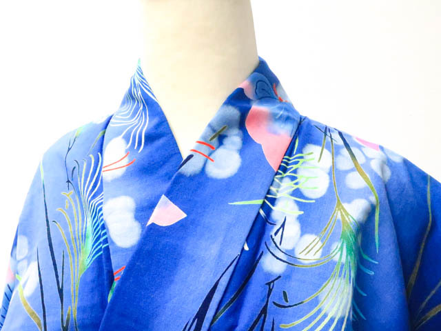 - 《古美術京松》【着物】 浴衣 昭和レトロ コーマ地 植物に蝶文様 身丈約161.5cm 裄丈約65cm kyo7z04-178