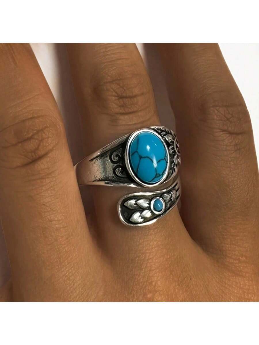 - リング レディース シングル 1個 ファッショナブルなヴィンテージエレガントな925シルバー インレイ人工ターコイズ テクスチャー