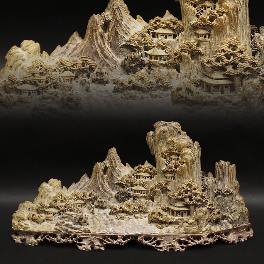 - 中国美術 中国古玩 楼閣山水図 立体高彫花図 玉製 砡製 寿山石 砡精密細工造 東洋彫刻 唐物 時代 骨董 幅約43×重量約5720g 古美術品