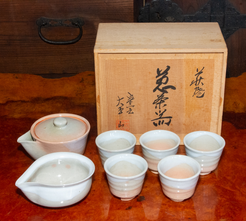 - 萩焼 大平山窯 煎茶器 在銘 共箱 未使用品 煎茶道具 宝瓶 湯冷まし 湯飲み